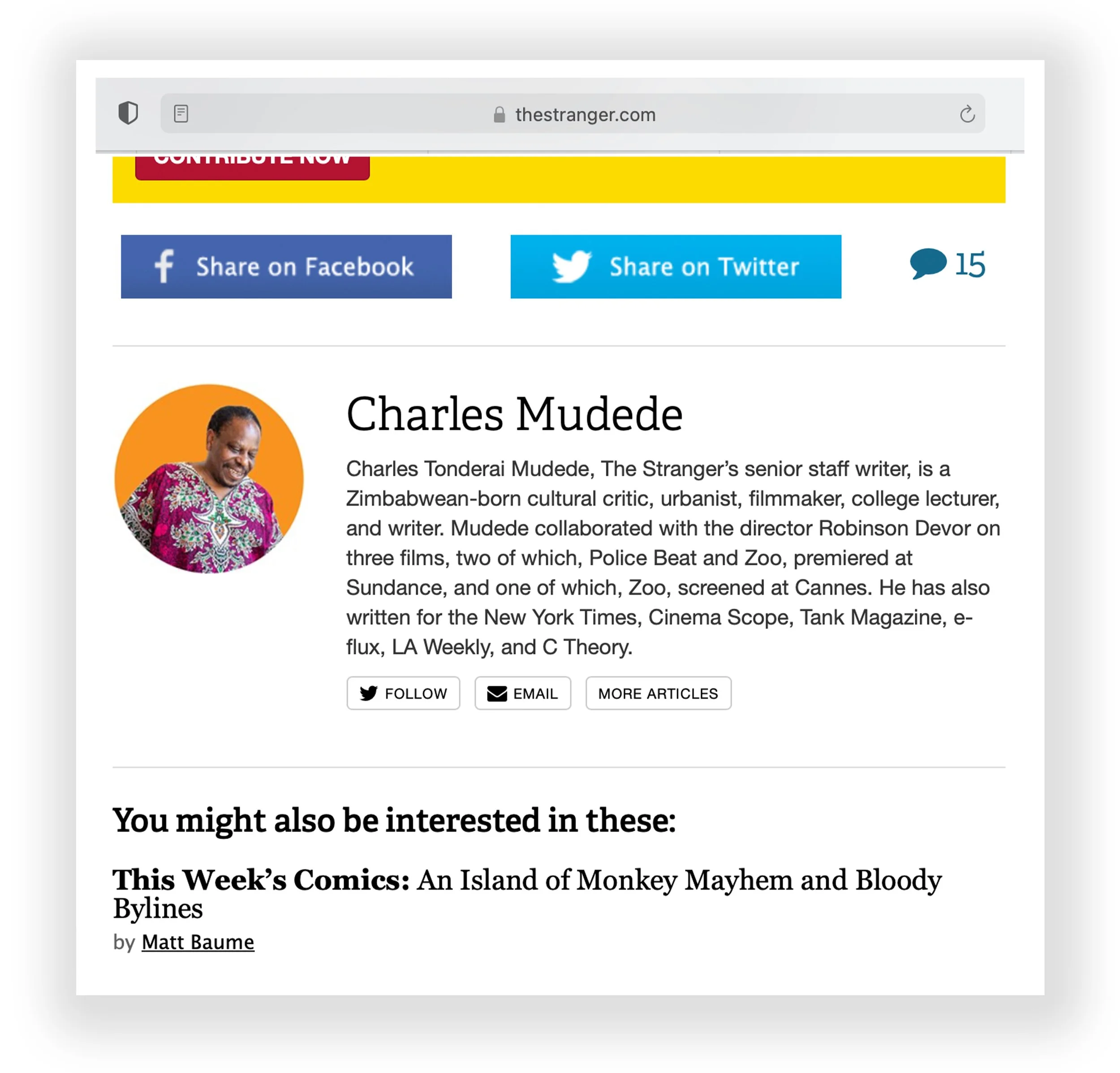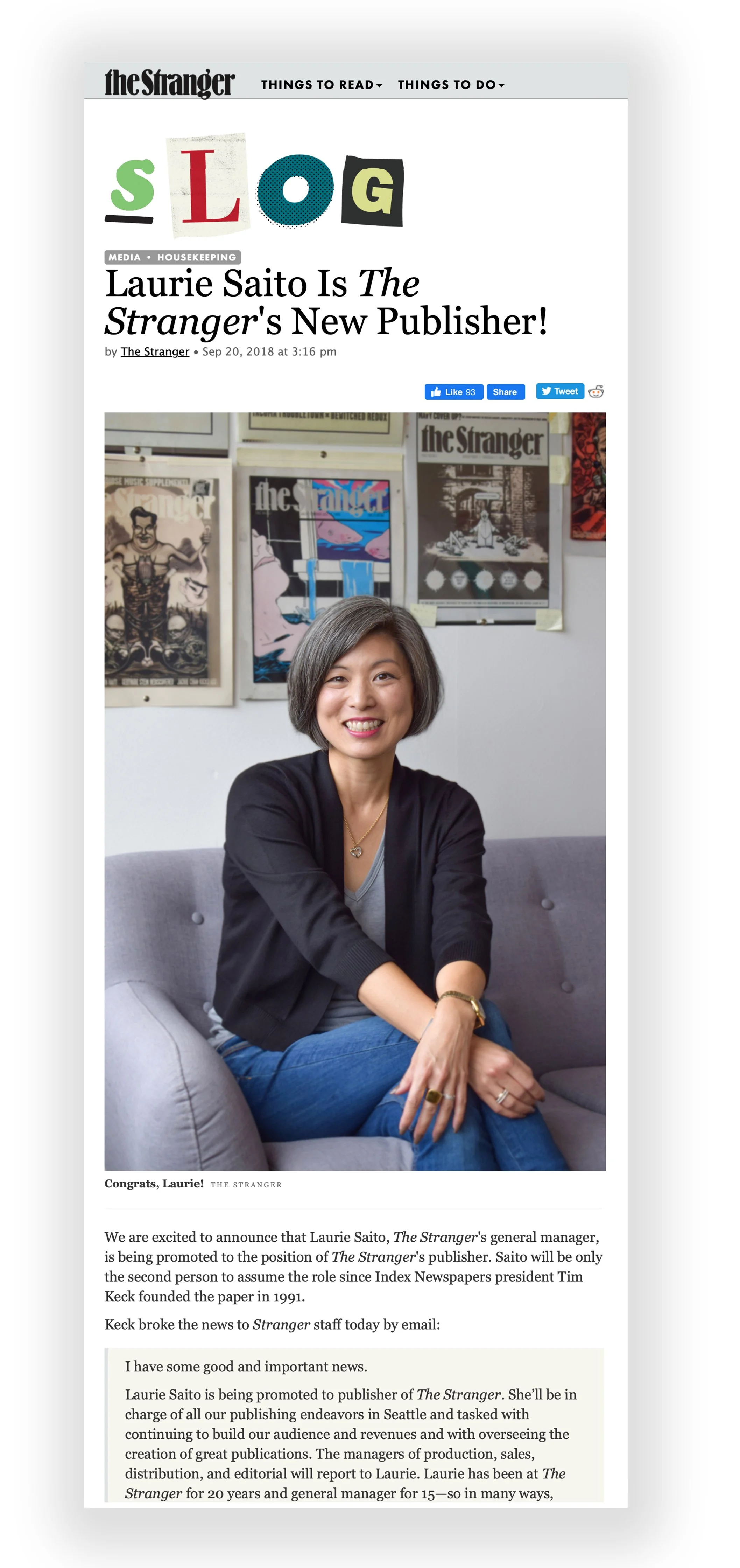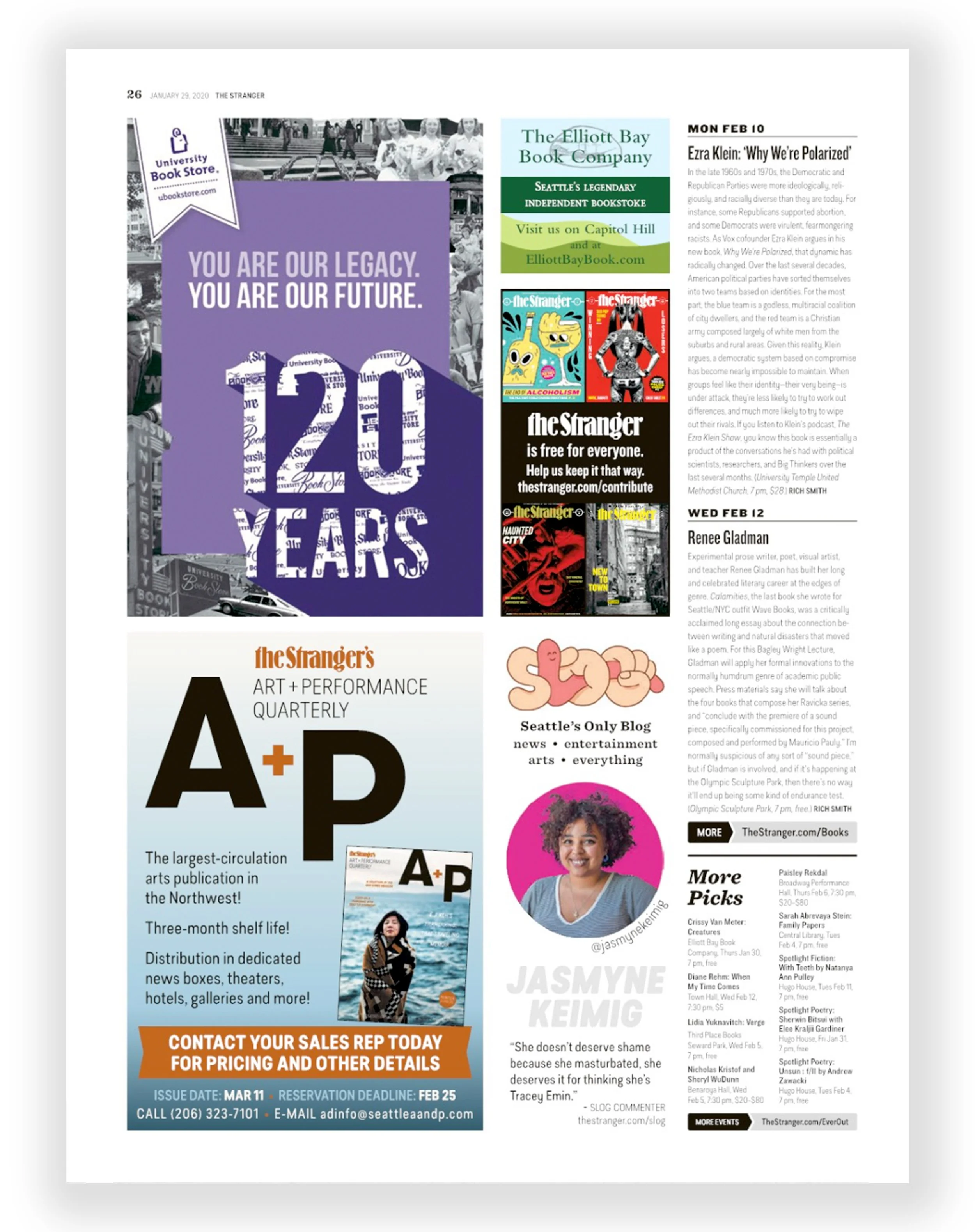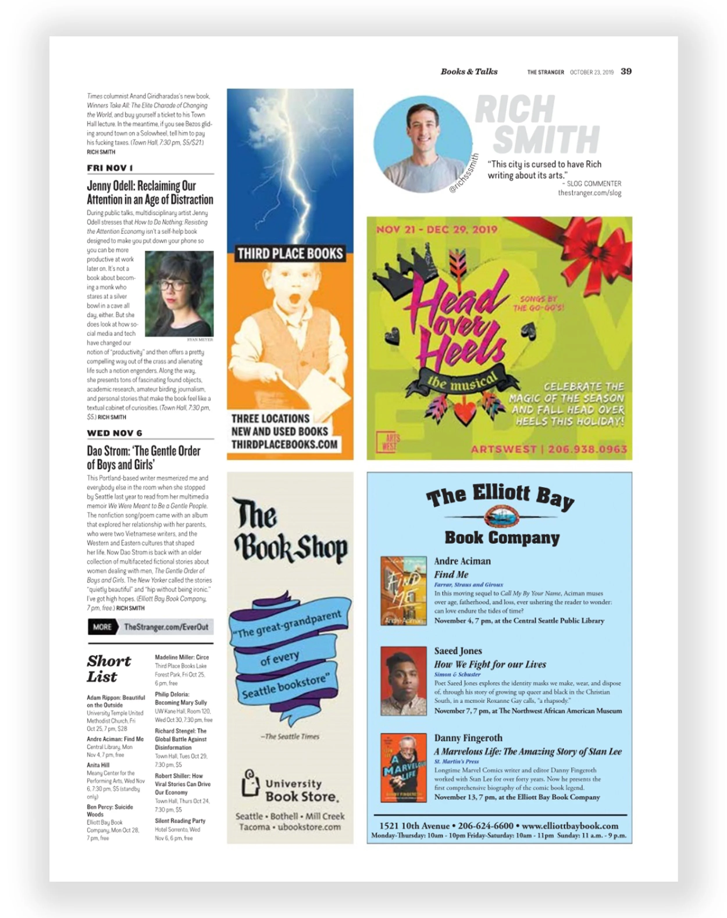 One of the great things about working at The Stranger was that I always had an opportunity to photograph. In this section, you’ll see that during the great website overhaul of 20-whatever, I was tasked with photographing the entire staff for their bios. These images were then plopped up against some flattering colored backgrounds and paired with their writer bios (online), or with funny—and often rude—quotes about them that we ripped from the comments section of our blog (print). I also had the pleasure to photograph our new publisher for a congratulatory piece on her promotion, as well as a few other pieces for print.